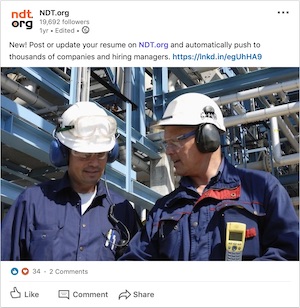 With 50,000 social media followers, NDT.org can broadcast your message instantly to our audience. Our followers include over 36,000 members on LinkedIn, over 10,000 followers on Facebook, and over 3,000 followers on Twitter. Promoted posts can include text and images to make your message stand out.