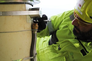 Following successful completion of the feasibility work in the development of a riser carcass monitoring system, MISTRAS were commissioned to install two acoustic emission monitoring systems (AEMS) to permanently monitor seven production risers across two North Sea platforms. The AEMS’s that were installed on the two platforms were designed using intrinsically safe hardware supplied by Physical Acoustics Corporation. Four AE sensors of varying frequency sensitivity were installed on the neck section of each riser topside termination (see Figure 7). The sensors were permanently installed using a high strength structural adhesive and reinforced with a mechanical strap. The sensors were cabled back to the multi-channel data acquisition system located in a safe control room via in-field signal amplifiers and isolating safety barriers. Installation and commissioning of each riser monitoring setup was completed, on average, within two working shifts.