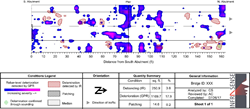 The GPR data collection system included a pair of 2 GHz horn antennas and a SIR 30 control unit, both manufactured by GSSI in the United States. The infrared survey was performed using a FLIR camera mounted on top of the survey vehicle along with a visual feed for reference. The final report included a quantitative table of deterioration, debonding, patching, and spalled areas. A select number of the decks were chosen by the client for further reporting, where Infrasense provided plan-view maps of their findings, along with ground-truth confirmation at suspect locations on the decks. Finally, the report included an underside visual inspection summary, with pictures and descriptions.