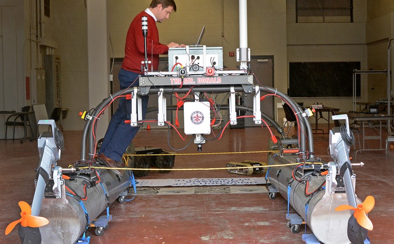 Image: Joshua Vaughn and his robotics and controls research group at the University of Louisiana at Lafayette are working with Japanese developer HiBot Corp. to develop a "cable-driven parallel manipulator" to inspect vertical metallic surfaces such as in chemical storage tanks. Photo by Terri Fensel.