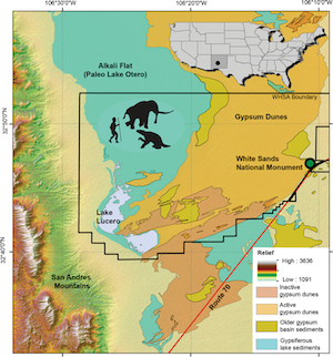 Trace fossils in the form of footprints (tracks) occur more frequently in the palaeontological and archaeological records than is commonly assumed. Holocene and Plio-Pleistocene examples have been described at an increasing number of sites and are found primarily in unlithified, erodible substrates1,2,3,4,5. Footprints provide evidence of an animal’s presence, pedal anatomy, abundance, co-association with other animals and behavioral ecology, and have been used to infer not only body size and mass, but also pedal anatomy and biomechanics6. At some locations, especially in the American southwest, these important yet delicate fossils may hold the key to unanswered questions about human behavior during the upper Pleistocene, particularly those related to hunting activity, with footprints offering access to predator-prey interactions outside the more typical "site" locus of a kill or camp7. How researchers detect and record fossil footprints is a burgeoning area of method development in contemporary ichnology8,9,10,11, and crucial to both maximizing the information yielded and also preserving these fragile traces of the past12. Former lake beds and playa sites, which occur extensively across the Americas and in parts of Africa, have the potential to hold these latent ichnological archives.