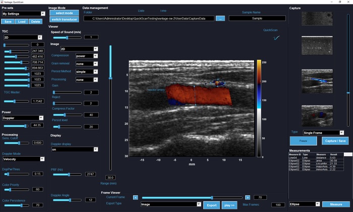 The SoniVue QuickScan is designed to provide an easy-to-use interface and thus, will simplify research in clinical and preclinical applications by easing communication with sonographers and physicians who may have limited engineering experience. When planning an interdisciplinary or clinical study with Vantage systems or discussing results, SoniVue QuickScan could be used to acquire images, identify regions of interest, and help explain ultrasound images easier than with the Vantage system’s basic Research GUI.