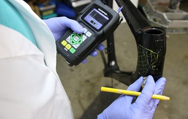 Ruckus Composites has evaluated more than 13,000 carbon fiber bicycles and repaired more than 6,000 since it opened in 2008, and also works with professional racing teams and bicycle shops all over the world. About four years ago, the shop’s owner and chief engineer, Shawn Small, invested in an Olympus (Waltham, Mass., U.S.) 45MG ultrasonic thickness gage for high-tech carbon fiber inspection, investigation and quality control. According to Olympus, Ruckus Composites’ inspection and repair process begins with using the Olympus gage for ultrasound scanning and damage mapping.