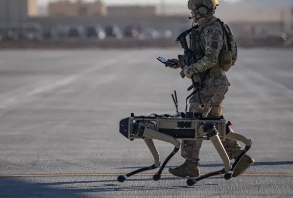 Tech. Sgt. John Rodiguez, 321st Contingency Response Squadron security team, patrols with a Ghost Robotics Vision 60 prototype at a simulated austere base during the Advanced Battle Management System exercise on Nellis Air Force Base, Nev., Sept. 3, 2020.