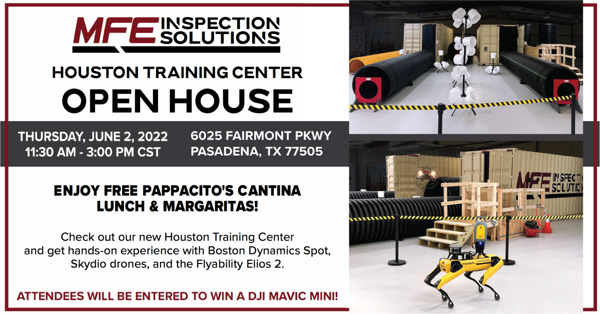 MFE Inspection Solutions invites customers to celebrate the opening of our new MFE Training Center at our Houston office on June 2, 2022, from 11:30-3 pm. The new facility features an obstacle course designed for objective-based training with advanced drone and robotics equipment such as Boston Dynamics' Spot, the Flyability Elios 2, Skydio autonomous drones, and the DJI Matrice 300 RTK.