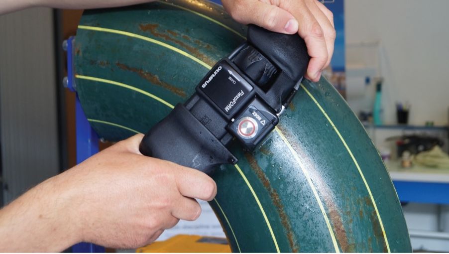 Jérôme Lethuillier, engineer for Mistras, using the FlexoFORM scanner on a pipe elbow sample with the OmniScan™ X3 phased array flaw detector (images courtesy of CEM magazine)