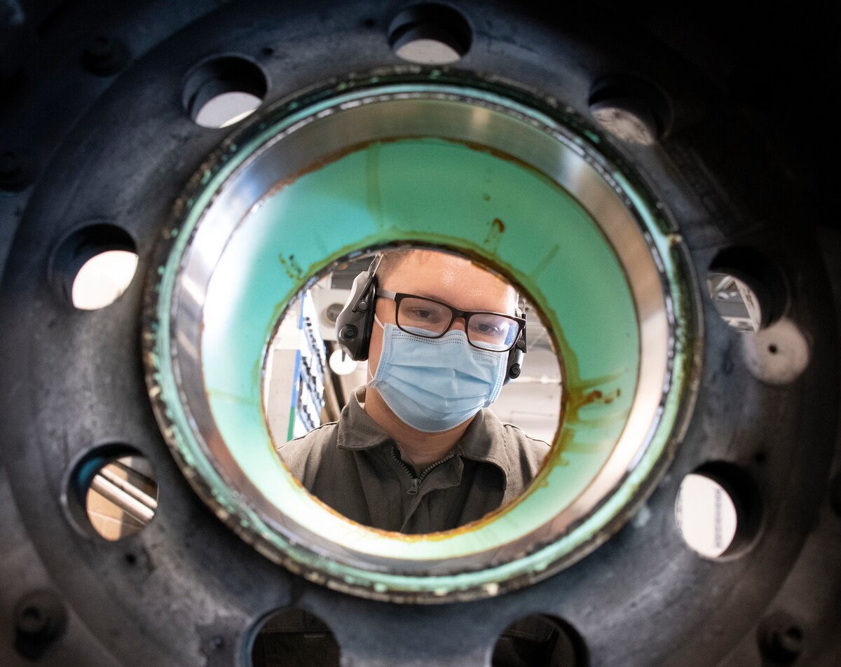 U.S. Air Force Senior Airman Joseph Palke, 60th Maintenance Squadron wheel and tire team member, peeks through a wheel at the wheel and tire shop at Travis Air Force Base, California, July 14, 2022. The 60th MXS wheel and tire shop conducts wheel and tire maintenance services and inspections for the C-17 Globemaster III and C-5M Super Galaxy. The 60th MXS also supplies completed wheel assemblies for the Pacific Air Forces region. (U.S. Air Force photo by Heide Couch)