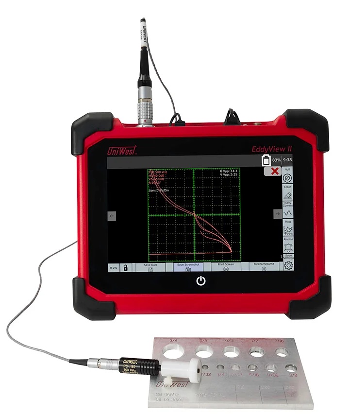 The EddyView II also includes multi-frequency probe drive and signal mixing, digital conductivity & non-conductive coating thickness, and compatibility with UniWest’s ECS-1S & JF-15 rotating bolt hole scanners. In addition, the EddyView II can be connected to the internet for remote diagnostics and calibration, as well as export raw eddy current data for post-processing flexibility.