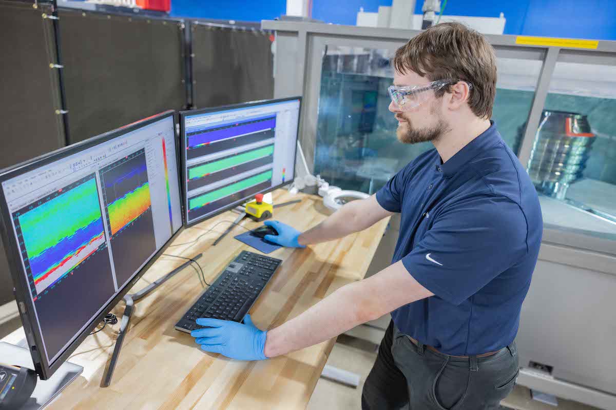 Nick Van Zandt, an AIS Lead Engineer, studies the scan of an engine part submerged in an ultrasonic immersion tank Above: Nick Van Zandt, an AIS Lead Engineer, studies the scan of an engine part submerged in an ultrasonic immersion tank. Top: Stetson Watkins, Advanced Lead Engineer for Inspection Testing performs an enhanced ultrasound inspection on a high-pressure turbine blade disk in GE’s Aerospace Inspection Services (AIS) facility in Evendale, Ohio.