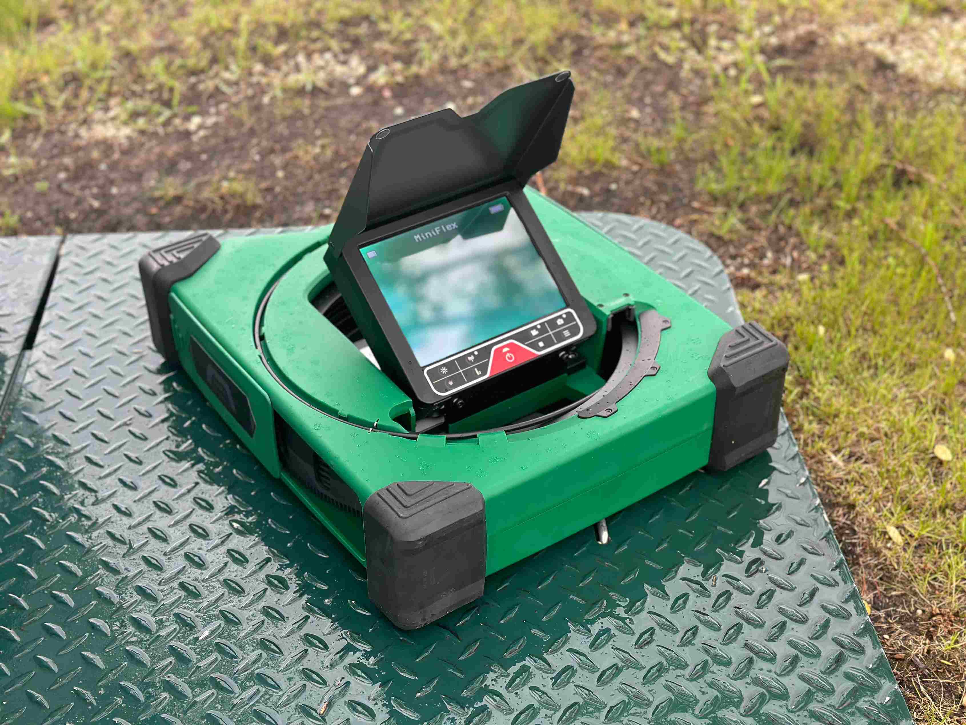 The portable image hub features an 8.0-inch color display with 1024x768 pixel resolution, housed in a protective metal casing with a daylight sun shield for optimal viewing in bright conditions. The inspection tool also includes a text generator for adding notes to recordings and an onscreen meter/footage counter. Powered by a rechargeable battery, the MiniFlex Camera provides up to 7 hours of operation on a single charge.