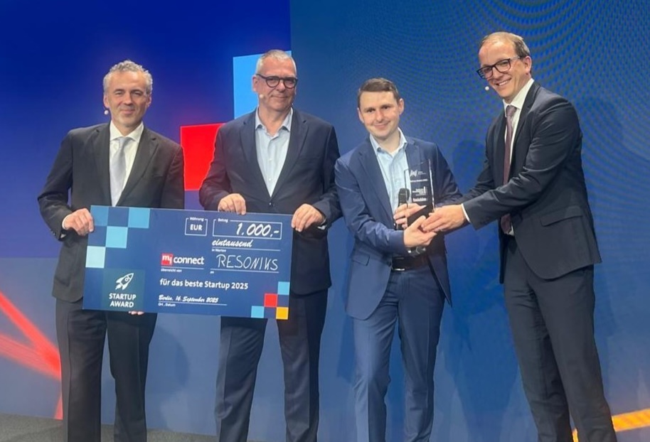 From the applications submitted, a jury of experts nominated three finalists in advance for the pitch final on September 16, 2025, at the Mechanical Engineering Summit in Berlin. In front of around 600 decision-makers, RESONIKS from The Hague ultimately prevailed over its two competitors in a live vote. The startup impressed with its acoustic AI inspection, which analyzes metallic workpieces and detects even the finest structural defects - a solution that strikes a chord with the industry. In mechanical engineering, early defect detection is crucial for ensuring production quality, reducing scrap, and lowering costs. RESONIKS' technology makes the invisible audible, increases process reliability, and helps companies make their manufacturing more efficient.