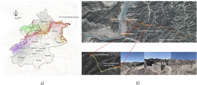 The Great Wall, as a UNESCO World Heritage site, embodies profound historical value and cultural meaning. Safeguarding the Great Wall is of paramount importance for promoting Chinese cultural heritage and preserving historical continuity (https://whc.unesco.org/en/list/438/, accessed 15 Nov 2025). In Beijing, the Ming Great Wall is widely distributed across six districts—Pinggu, Miyun, Huairou, Yanqing, Changping, and Mentougou—with a total preserved length of approximately 573 km (Fig. 1a) (https://www.chinadiscovery.com/great-wall/facts/how-long-is-the-great-wall-of-china, accessed 15 Nov 2025). The walls are primarily constructed with tamped earth cores faced with bricks, filled with local rubble and compacted soil, and bound with lime mortar as the principal adhesive1,2. Nevertheless, after centuries of natural weathering and anthropogenic influences, concealed structural pathologies—including voids, detachments, and water infiltration—have developed within the masonry, posing a threat to its stability. For instance, during the initial construction phase, shrinkage cracks often formed in the mortar joints as the material dried. Under cyclic freeze-thaw and hydraulic erosion processes, these microcracks propagated, eventually producing internal voids or detachments between bricks and rammed earth.