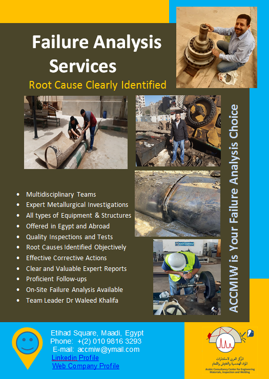 The Arabic Consultancy Center for Engineering Materials, Inspection and Welding (ACCMIW) is a company located in Egypt, with business focus on engineering materials consultations, failure analysis and prevention, quality control, inspection, NDT and welding.